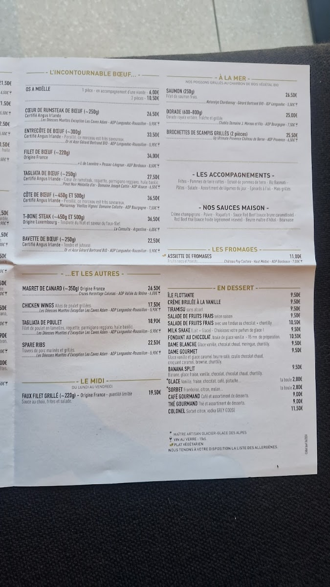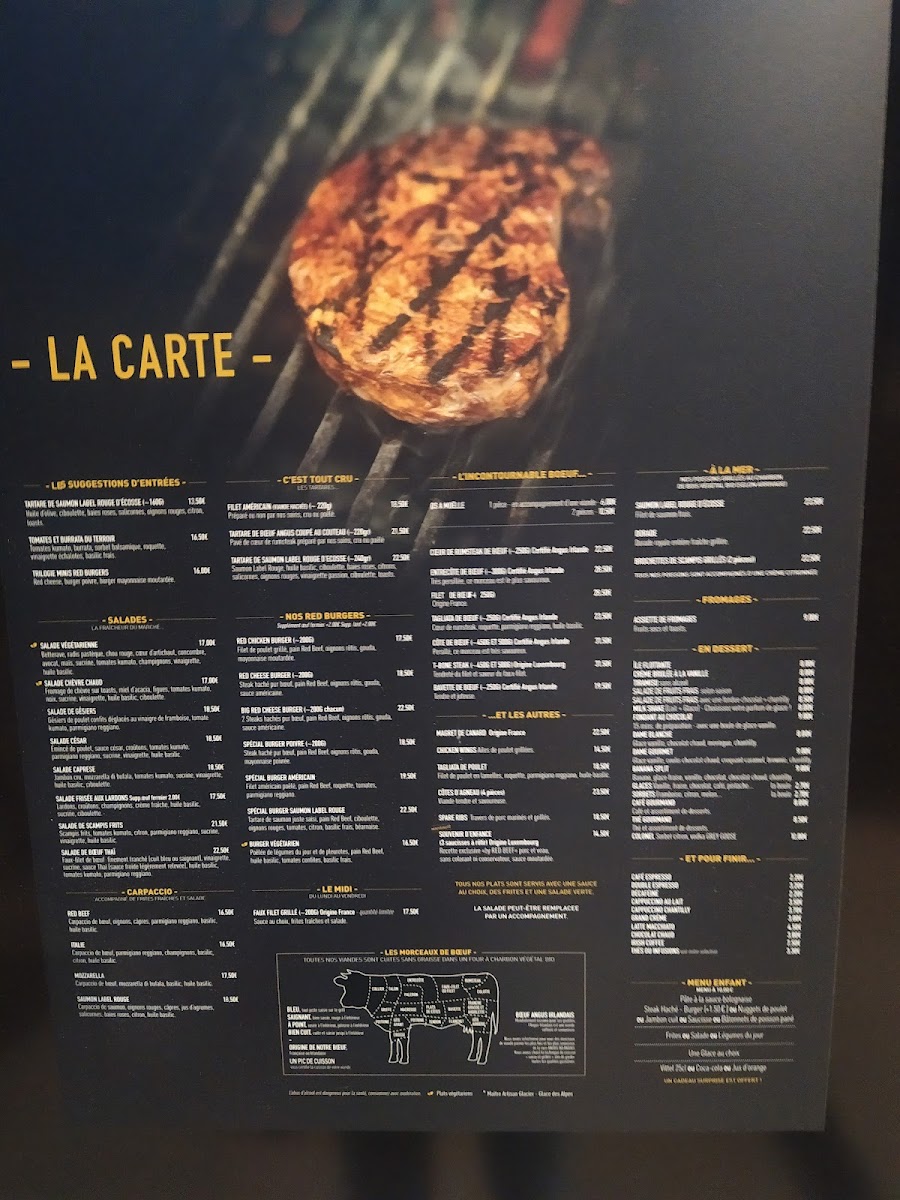 The star attractions are undoubtedly the burgers. Savor the Red Cheese Burger made with 100% Angus beef, a testament to indulgence and quality, complementing every bite with gourmet toppings. Not to forget, the Bavette De Bœuf and Cœur De Rumsteak highlight the succulent offerings from the grill, appealing to both meat lovers and vegetarians alike.
